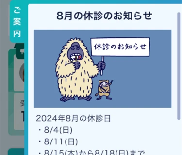 「ご案内」をタップしていただくと、医院さまごとに設定いただいたお知らせ内容を患者さん側でご確認いただけます。