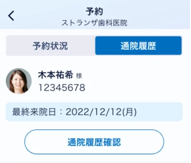 実物の診察券のように名前・診察券番号・アイコン・次回予約が表示されます。
