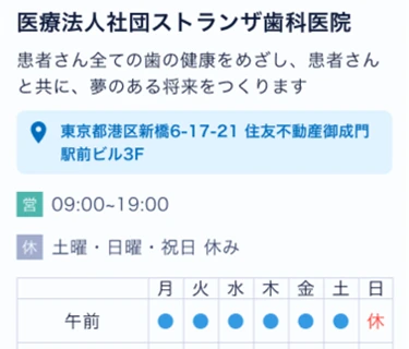 画像・医院名・診療時間や定休日、ホームページのURLなどを表示することができます。