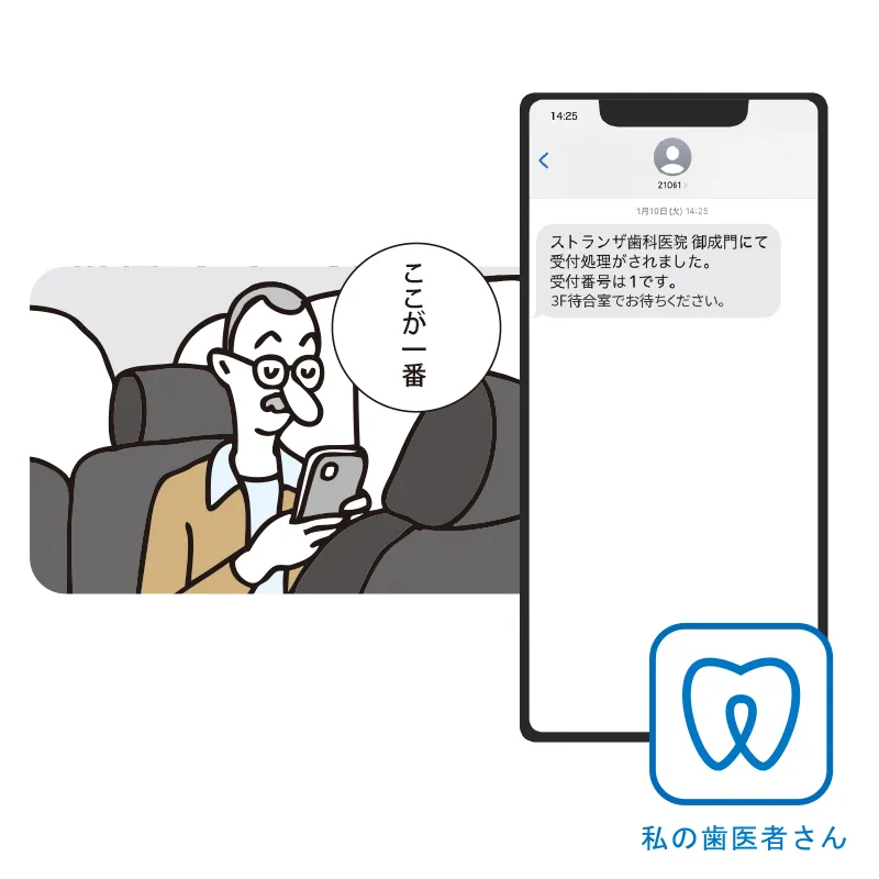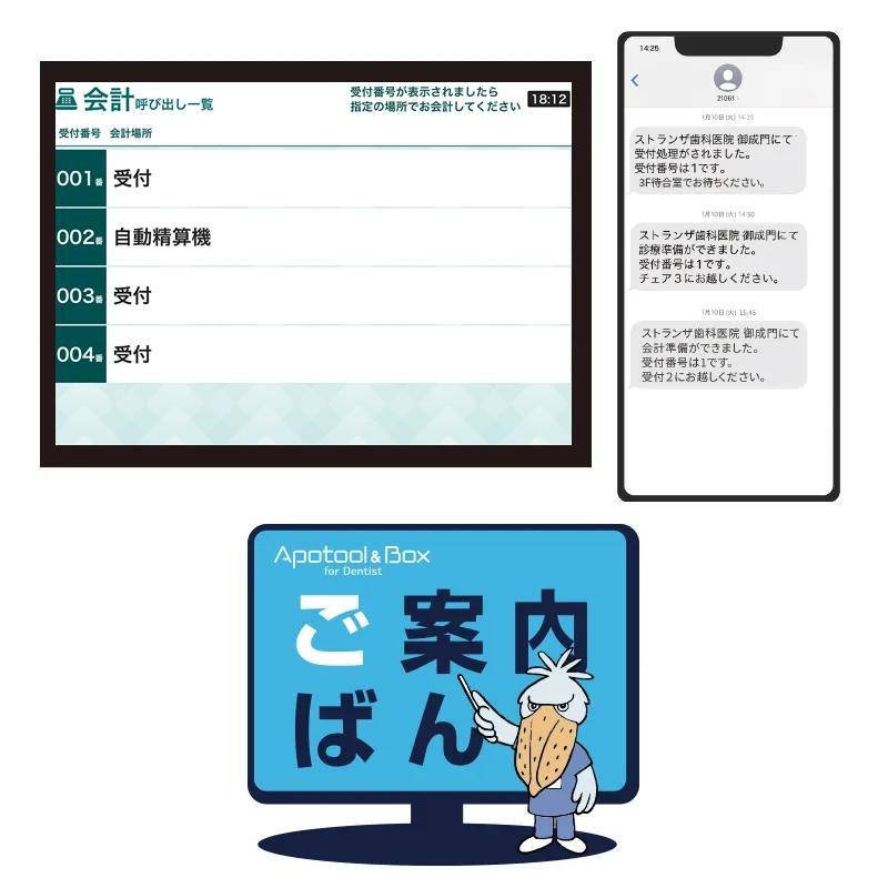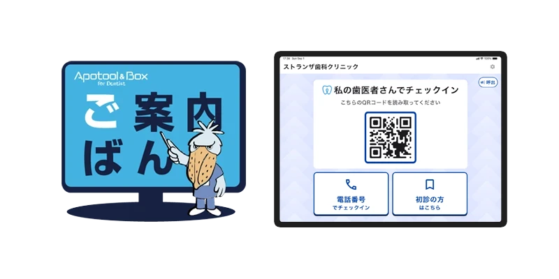 患者呼出機能「ご案内ばん」は、診察券アプリ「私の歯医者さん」を利用したQRコードによる来院受付、または電話番号による来院受付で受付処理を行うことができます。