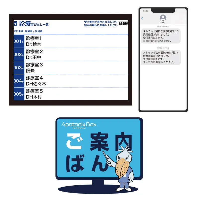 予約管理システムのApotool&Boxと連携しているため、院内のどこにいても患者さんの来院状況を把握することができます。
