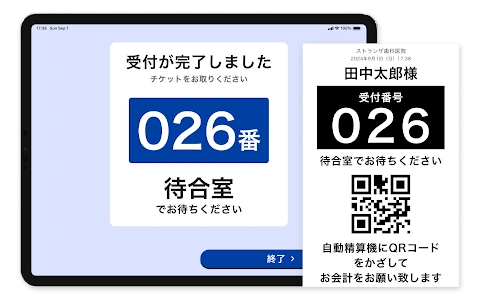 受付が完了すると、受付番号が発行され、待合室への案内が表示されます。