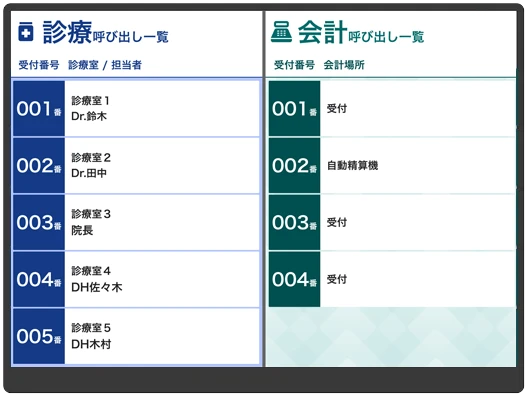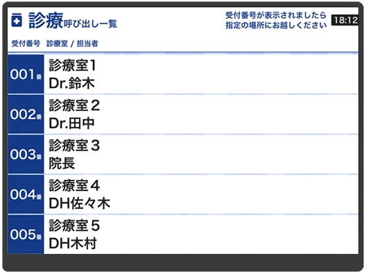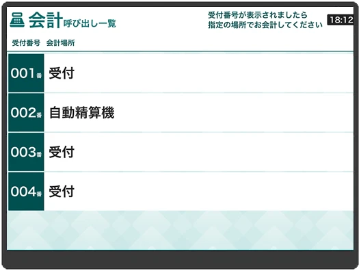 会計の準備が完了したら、待合室内のディスプレイに受付番号とお支払い場所を表示させ、患者さんをお呼びします。