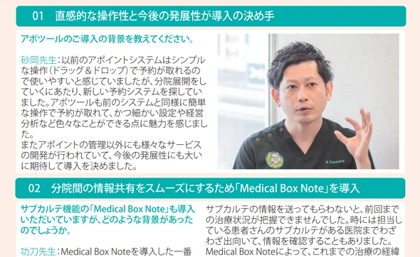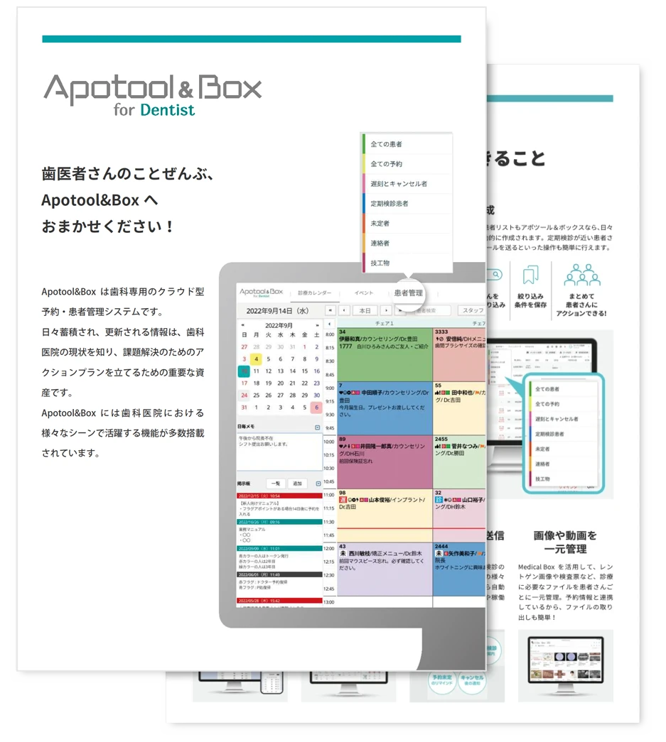 Apotool&Boxで使える機能の概要から料金プランまで、システムの基本情報が把握できる資料と、実際にApotool&Boxを導入されている歯科医院様のご活用事例を掲載した資料の2点セットをダウンロードいただけます。