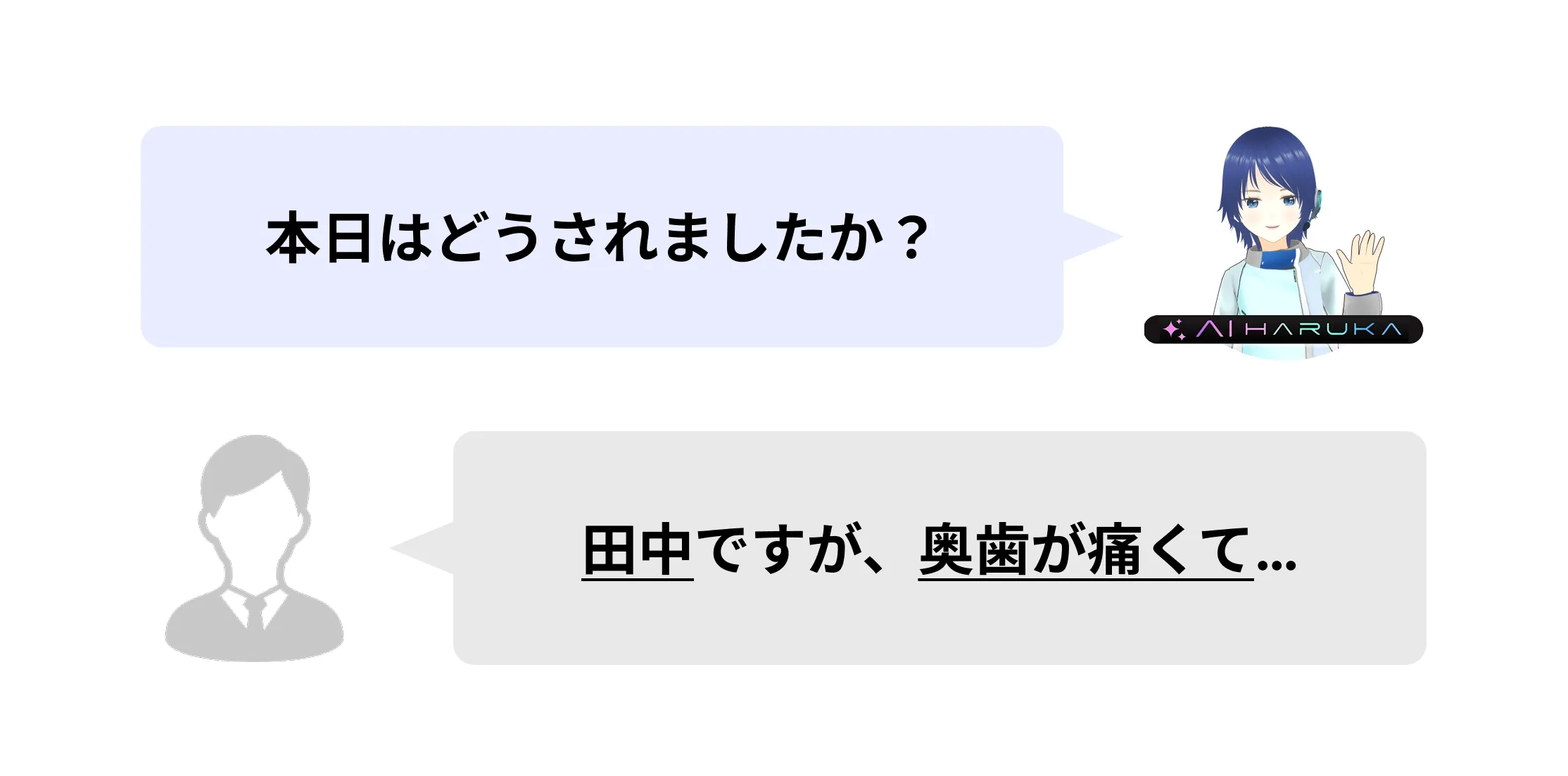 この時点で、名前(田中さん)と、主訴(奥歯が痛い)といった情報が取得できているため、以降の会話で名前や主訴を繰り返し聞く必要がなくなります。