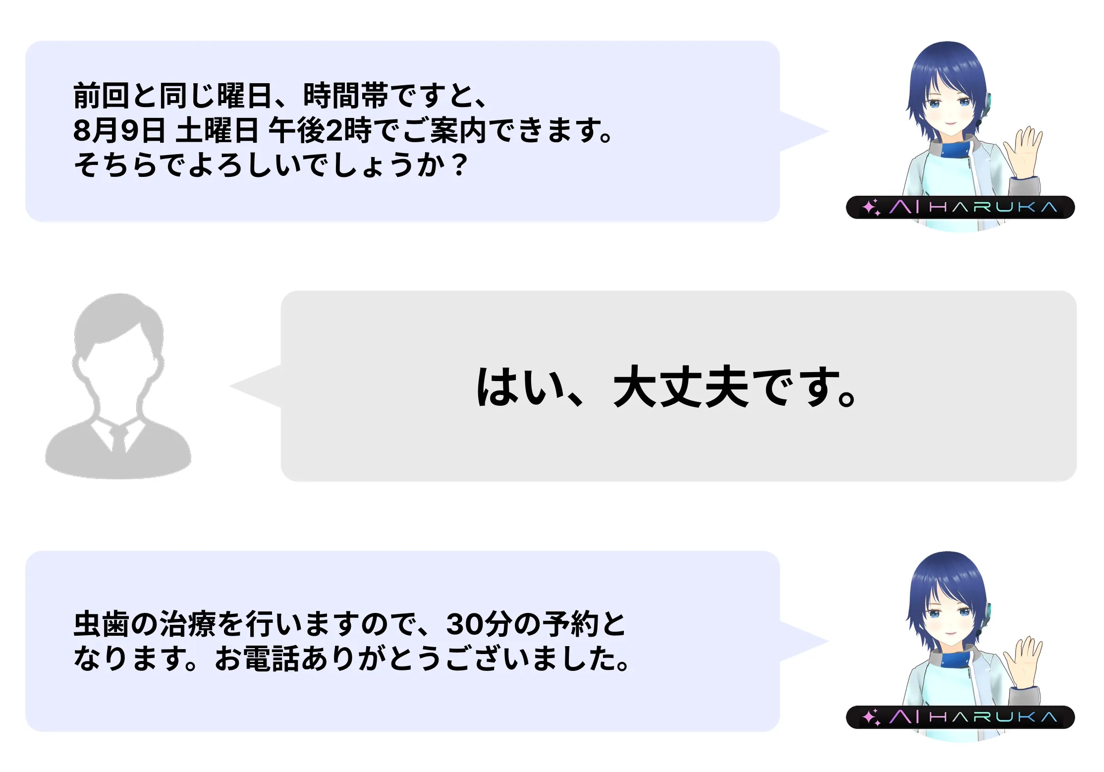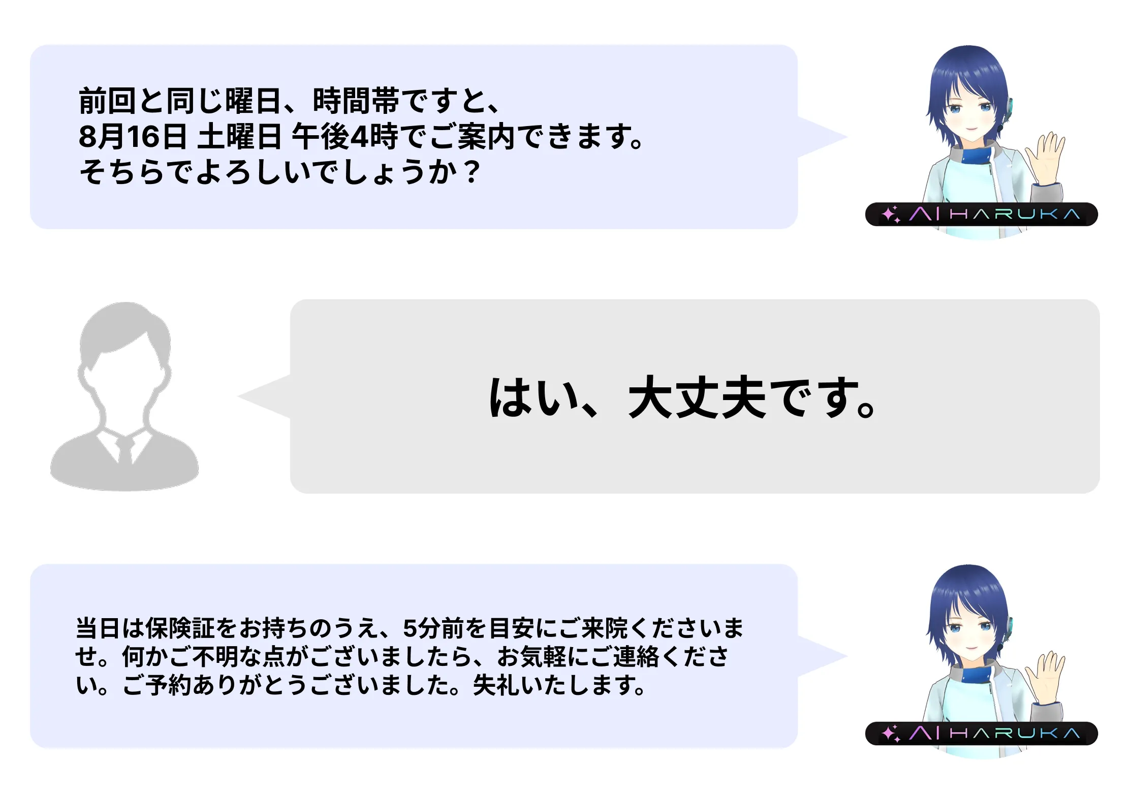 - 「次の予約っていつでしたっけ?」(※複数予約がある場合は、直近の予約情報を案内)