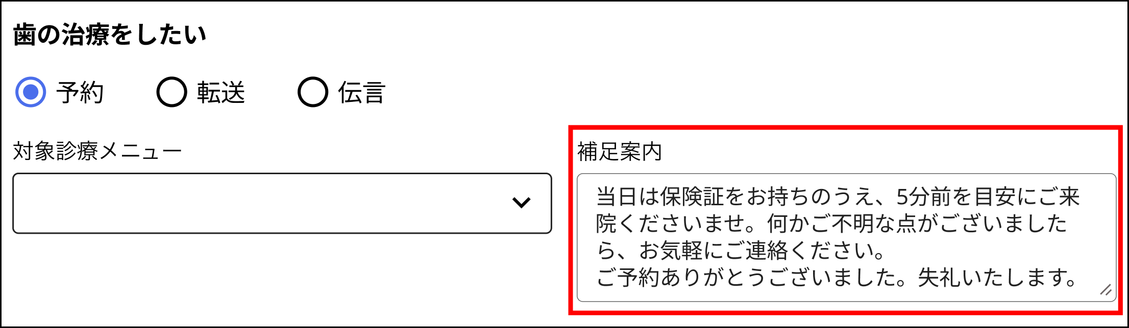 たとえば、行政検診の治療予約をされた患者さんには、検診時の持ち物など必要な情報を補足事項として伝えることが可能です。