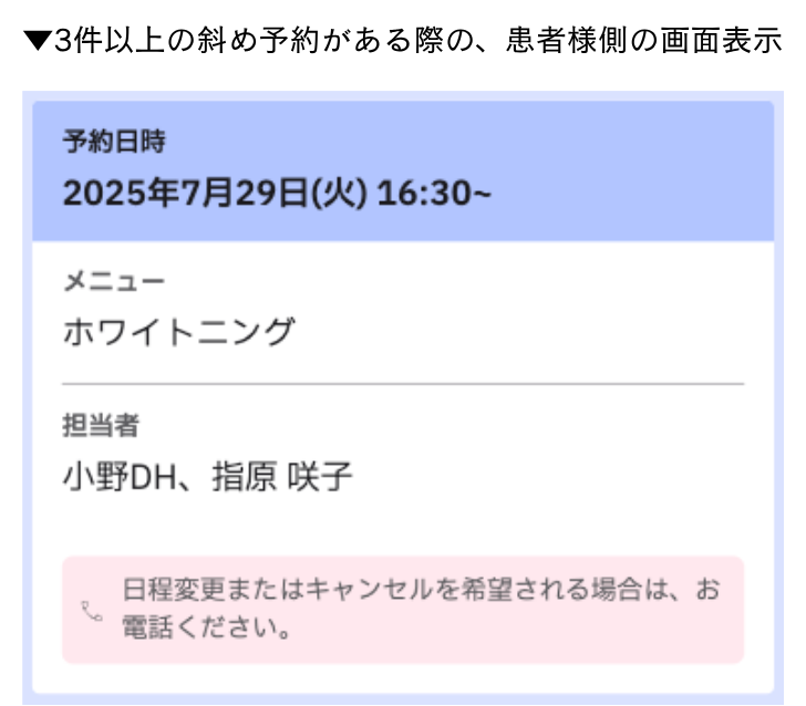 斜め予約であっても、患者さんがWebから日時変更・キャンセルできるのは最大2件までです。