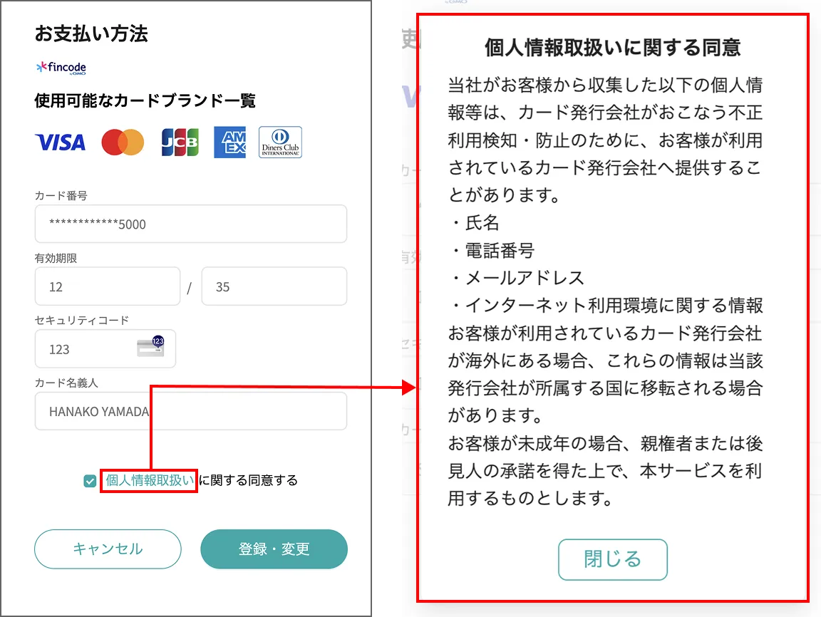 従来のクレジットカード登録画面に、「個人情報の取扱いに関する同意書」が追加されます。
