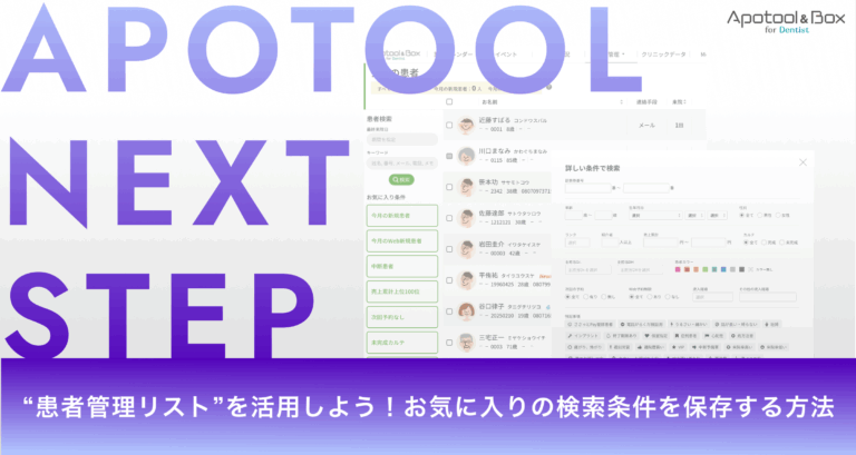 皆さんこんにちは!コラム担当のTです。 今回は、Apotool & boxのカレンダー機能にある、患者管理機能について解説したいと思います。 Apotool & boxを … 続きを読む “患者管理リスト”を活用しよう!お気に入りの検索条件を保存する方法