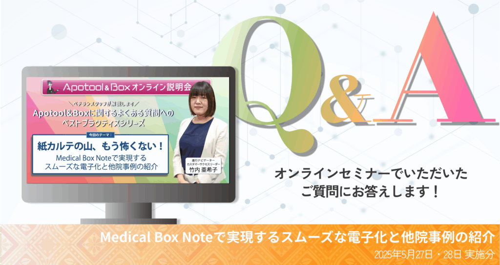 以上が「紙カルテの山、もう怖くない! Medical Box Noteで実現するスムーズな電子化と他院事例の紹介」でいただいたご質問への回答になります。