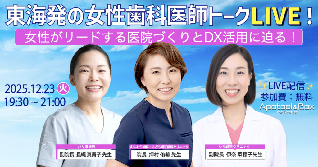 セミナー・イベント情報ご検討中の医院様、ユーザー様に向けてセミナー・イべントを開催しています。 セミナー 2025年 12月23日(火) 19:30~21:00 東海発の女性歯科医師トークLIVE! 女性がリードする医院づくりとDX活用に迫る! 参加費 無料 セミナー 2025年 11月27日(木) 19:30~21:00 “予約改革”がスタッフ育成の第一歩!~自走するチームが医院を変える、スマートな経営革新~ 参加費 無料 セミナー 2025年 10月29日(水) 19:30~21:00 10年予後も夢じゃない! 明日からできる審美性と長期予後を実現する積層充填のレシピ 参加費 無料 セミナー 2025年 10月23日(木) 13:30~14:00 2025年 10月23日(木) 19:30~20:00 2025年 10月24日(金) 13:30~14:00 2025年 10月24日(金) 19:30~20:00 デジタル活用の第一歩 患者さんともっと向き合える歯科医院へ 参加費 無料 セミナー 2025年 10月15日(水) 19:30~21:00 スタッフ不足に、どう立ち向かう?無人化×DXで実現する新しい医院のカタチ 〜紙・電話からの脱却と業務効率化のリアル〜 参加費 無料 セミナー 2025年 9月25日(木) 19:30~21:00 【現役女性院長が語る】Apotool&BoxでDXを実現。継続的右肩上がりの経営戦略 参加費 無料 セミナー 2025年 8月18日(月) 13:30~14:00 2025年 8月18日(月) 19:30~20:00 2025年 8月19日(火) 13:30~14:00 2025年 8月19日(火) 19:30~20:00 30分でわかる!AI電話予約受付サービス「電話がらくだ」オンラインセミナー 参加費 無料 セミナー 2025年 8月7日(木) 19:30~21:00 「口管強」フル活用できていますか?メリット・実例・歯科衛生士活用事例まで徹底解説! 参加費 無料 セミナー 2025年 8月6日(水) 19:30~21:00 「受付のカオスが消えた日」~アポツールで叶えた、静かな待合室~ 参加費 無料 セミナー 2025年 7月30日(水) 19:30~21:00 「キャンセルなんか怖くない!」~Web予約70%超え!攻める歯科医院の予約戦略~ 参加費 無料 123…9次へ