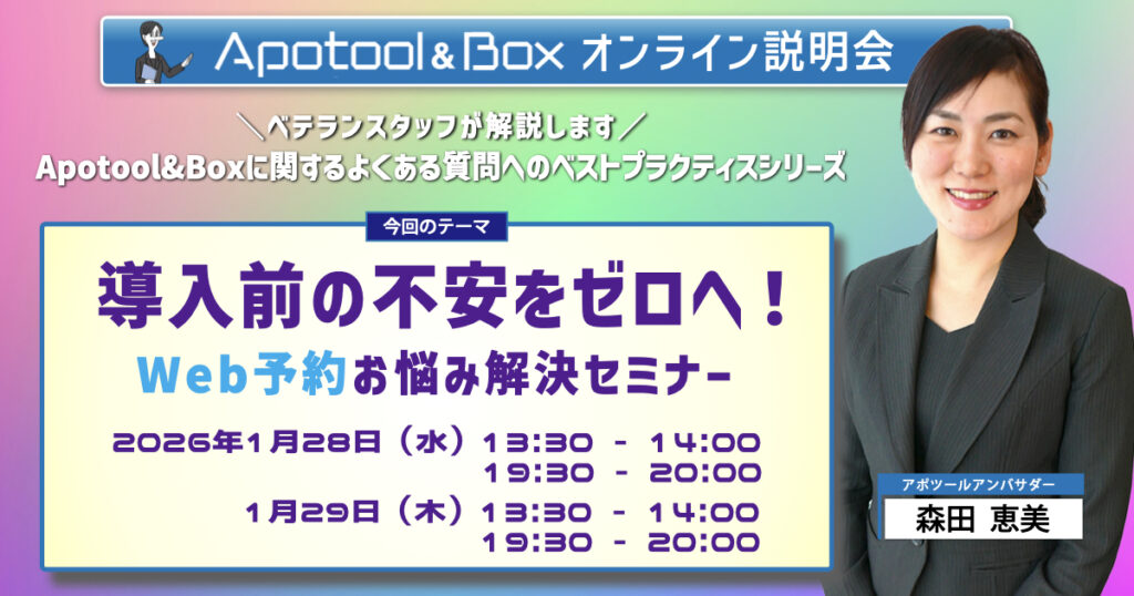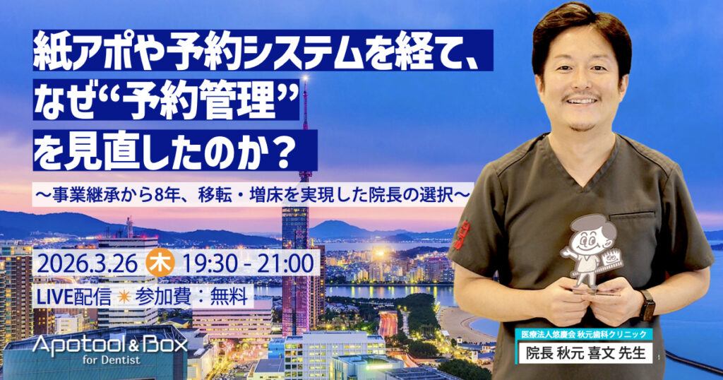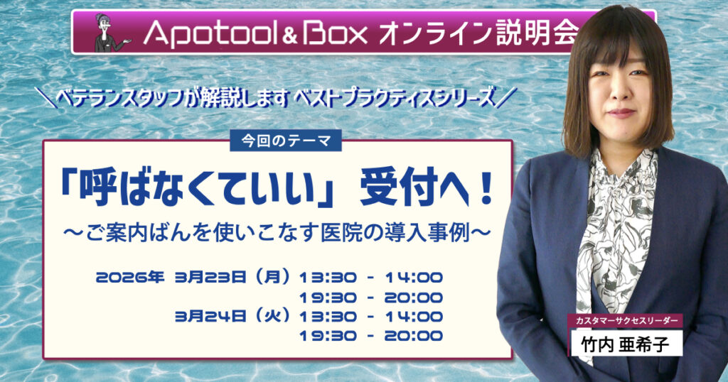 セミナーご検討中の医院様、ユーザー様に向けてセミナーを開催しています。 セミナー 2026年 3月26日(木) 19:30~21:00 紙アポや予約システムを経て、なぜ“予約管理”を見直したのか? ~事業継承から8年、移転・増床を実現した院長の選択~ 参加費 無料 セミナー 2026年 3月23日(月) 13:30~14:00 2026年 3月23日(月) 19:30~20:00 2026年 3月24日(火) 13:30~14:00 2026年 3月24日(火) 19:30~20:00 「呼ばなくていい」受付へ ~ご案内ばんを使いこなす医院の導入事例~ 参加費 無料 セミナー 2026年 2月18日(水) 13:30~14:00 2026年 2月18日(水) 19:30~20:00 2026年 2月19日(木) 13:30~14:00 2026年 2月19日(木) 19:30~20:00 導入前の不安をゼロへ!Web予約お悩み解決セミナー 参加費 無料 セミナー 2026年 1月14日(水) 13:30~14:00 2026年 1月14日(水) 19:30~20:00 2026年 1月15日(木) 13:30~14:00 2026年 1月15日(木) 19:30~20:00 キャンセル防止はスキマ時間で!Apotool&Boxで叶える簡単メッセージ活用術 参加費 無料 セミナー 2025年 12月23日(火) 19:30~21:00 東海発の女性歯科医師トークLIVE! 女性がリードする医院づくりとDX活用に迫る! 参加費 無料 セミナー 2025年 11月27日(木) 19:30~21:00 “予約改革”がスタッフ育成の第一歩!~自走するチームが医院を変える、スマートな経営革新~ 参加費 無料 セミナー 2025年 10月29日(水) 19:30~21:00 10年予後も夢じゃない! 明日からできる審美性と長期予後を実現する積層充填のレシピ 参加費 無料 セミナー 2025年 10月23日(木) 13:30~14:00 2025年 10月23日(木) 19:30~20:00 2025年 10月24日(金) 13:30~14:00 2025年 10月24日(金) 19:30~20:00 デジタル活用の第一歩 患者さんともっと向き合える歯科医院へ 参加費 無料 セミナー 2025年 10月15日(水) 19:30~21:00 スタッフ不足に、どう立ち向かう?無人化×DXで実現する新しい医院のカタチ 〜紙・電話からの脱却と業務効率化のリアル〜 参加費 無料 セミナー 2025年 9月25日(木) 19:30~21:00 【現役女性院長が語る】Apotool&BoxでDXを実現。継続的右肩上がりの経営戦略 参加費 無料 123…9次へ